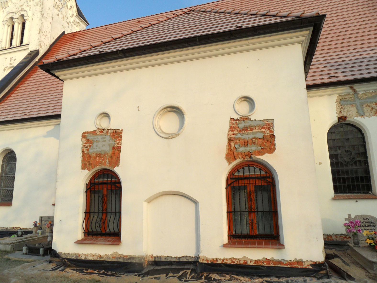 miejscowe uzupełnienie tynków oraz malowanie elewacji kościoła wykonano ze środków Gminy Kostomłoty oraz własnych Parafii