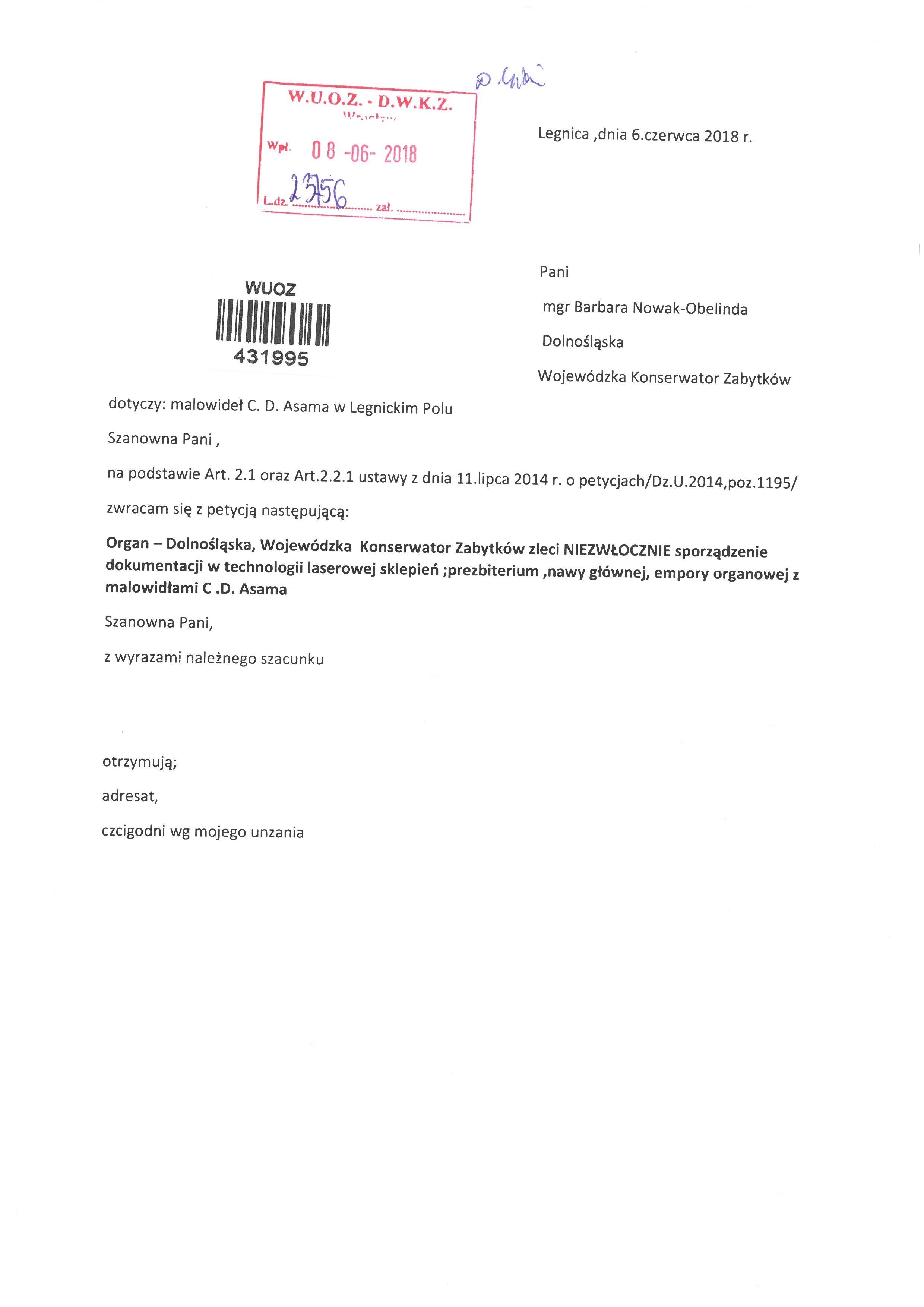 Odpowiedź na petycję w sprawie niezwłocznego zlecenia przez Dolnośląskiego Wojewódzkiego Konserwatora Zabytków sporządzenia dokumentacji w technologii laserowej sklepień, prezbiterium, nawy głównej, empory organowej z malowidłami C.D. Asama w Legnickim Polu - po kliknięciu otworzy się zakładka zawierająca dokument