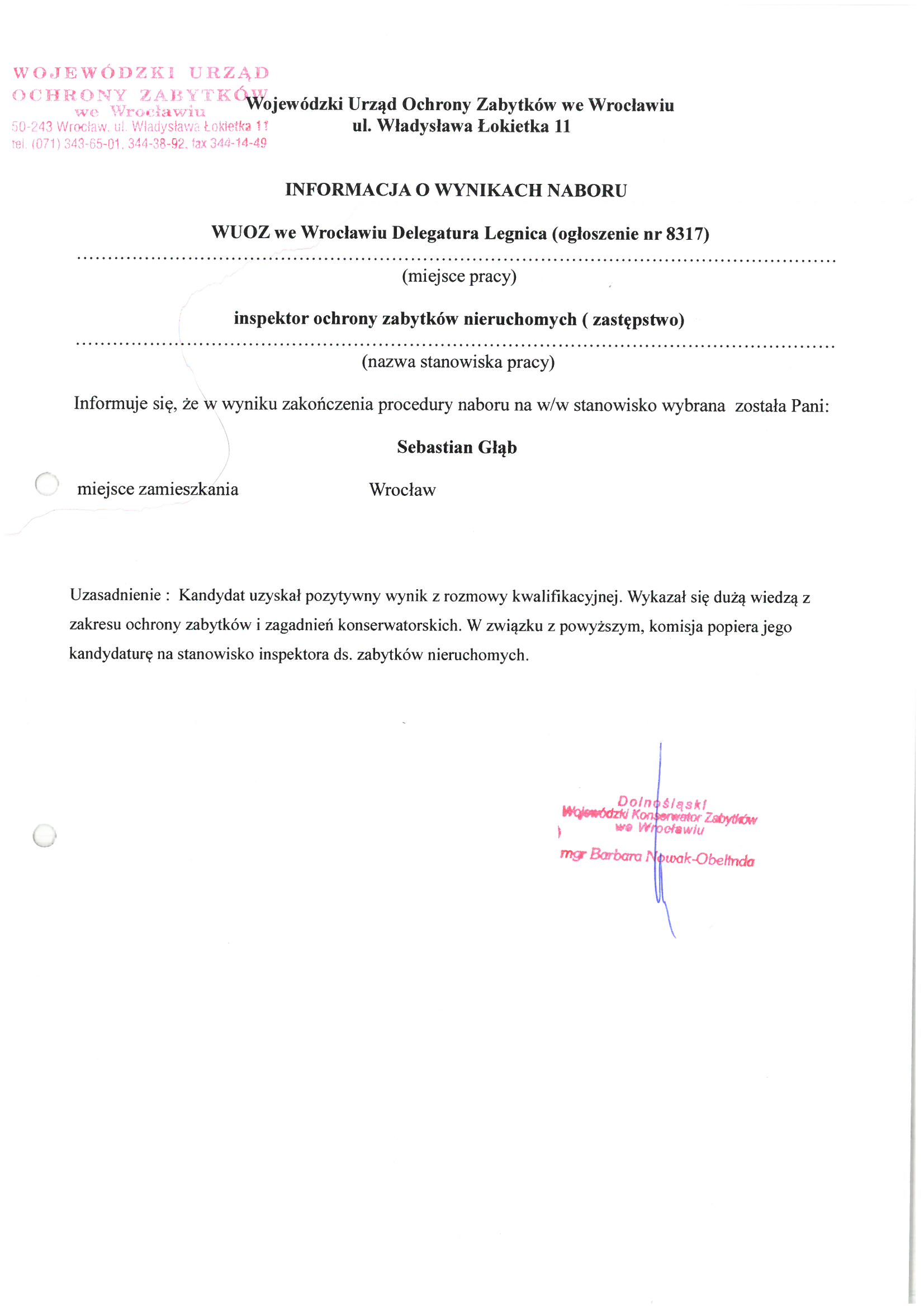 w Wojewódzkim Urzędzie Ochrony Zabytków we Wrocławiu Delegatura w Legnicy